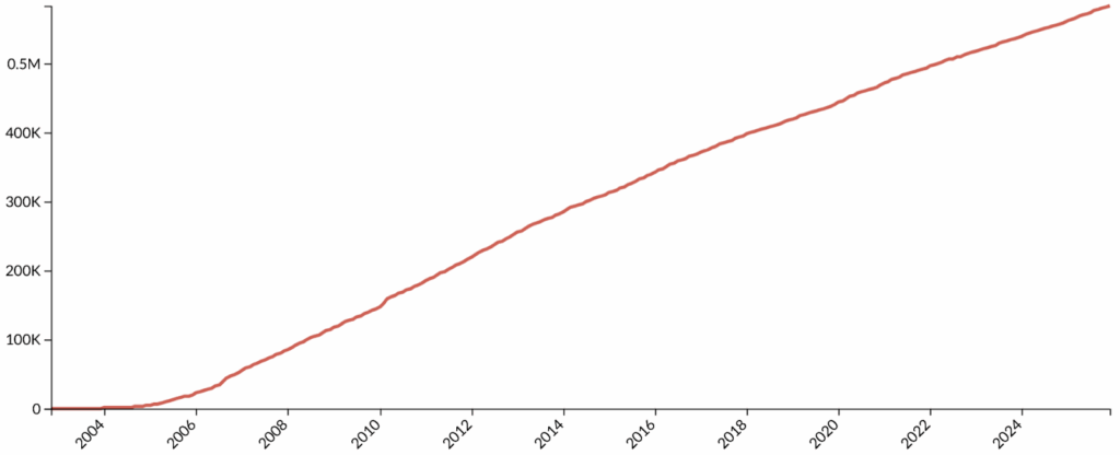 Graf vývoje počtu článků na české Wikipedii. Wikimedia Statistics, Public domain, via Wikimedia Commons