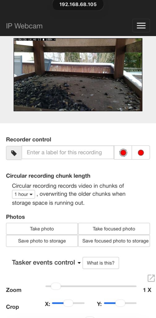 Teď už vidíte obraz ze svého krmítka. Pokud je obraz převrácený nebo otočený, změňte volbu „Flip“ v nastavení aplikace IP Webcam přímo v telefonu (viz výše). Když stejnou volbu změníte jen ve webovém rozhraní, neuloží se trvale a po restartu aplikace nebo telefonu se budete divit, proč je vše zase jinak.
